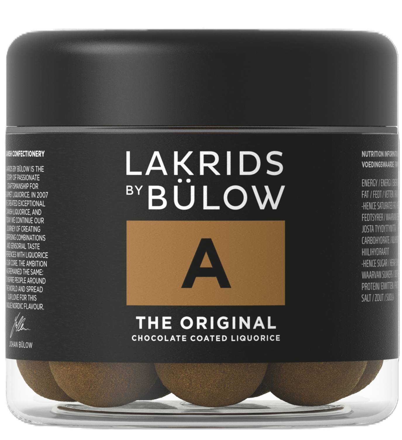 A – THE ORIGINAL war das erste Produkt, welches entwickelt wurde, nachdem Johan Bülow davon inspiriert wurde, Lakritz mit Schokolade zu überziehen – etwas, dass man in Dänemark zuvor noch nie gesehen hatte. Zunächst stand man der Idee in Dänemark sehr skeptisch gegenüber, aber schon bald erblickte A – THE ORIGINAL das Licht der Welt. Die Kombination aus süßem Lakritz, sorgfältig ausgewählter Premium Milchschokolade und einem feinen Lakritzpulver wird vielen Aussagen nach als äußerst süchtig machend empfunden.